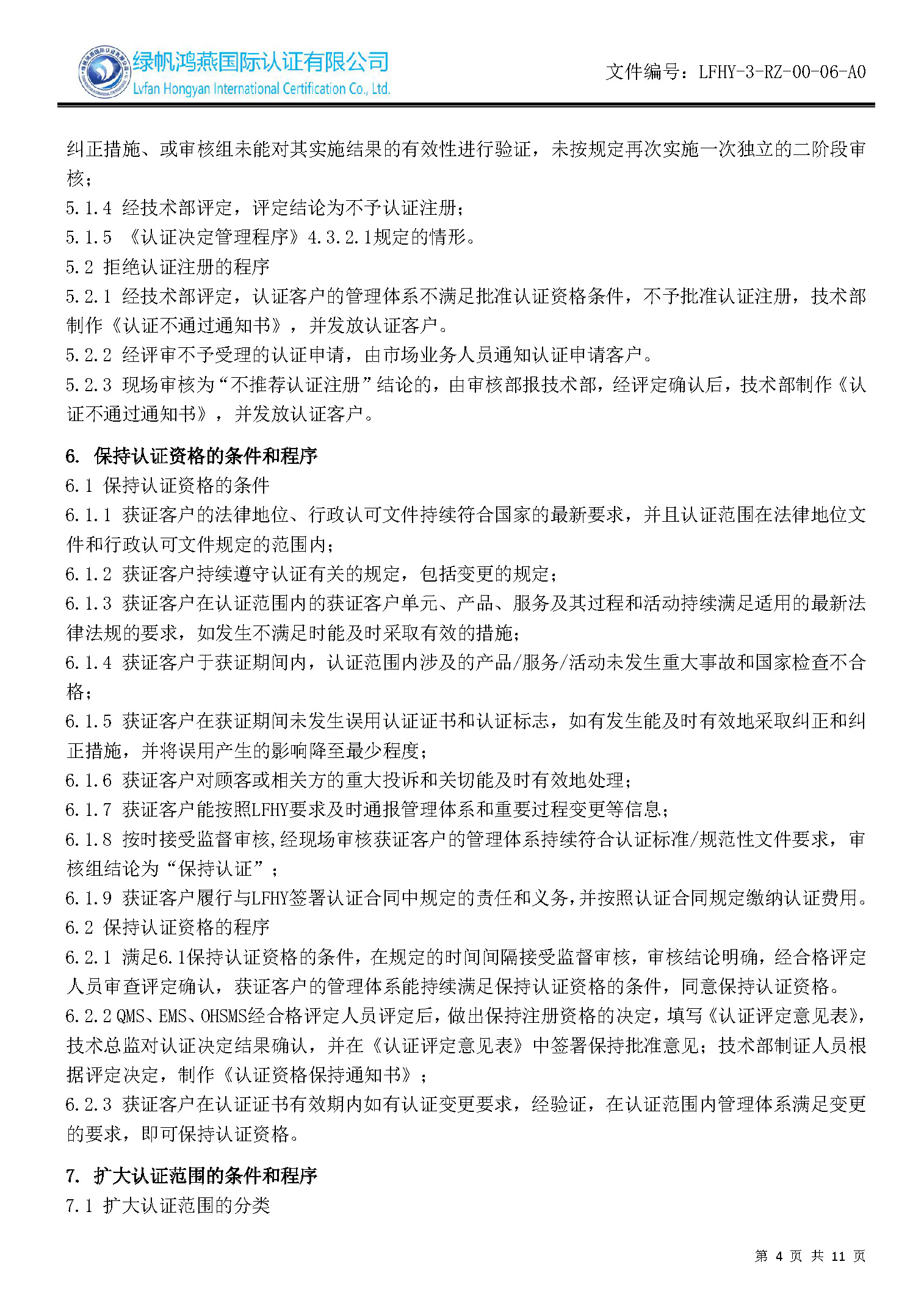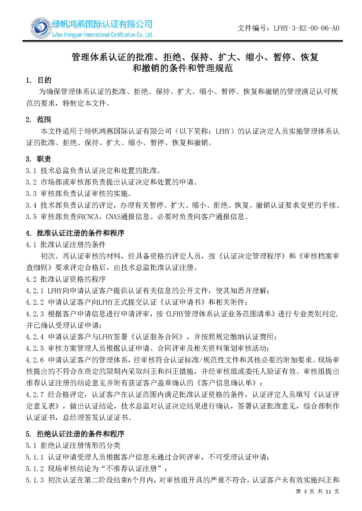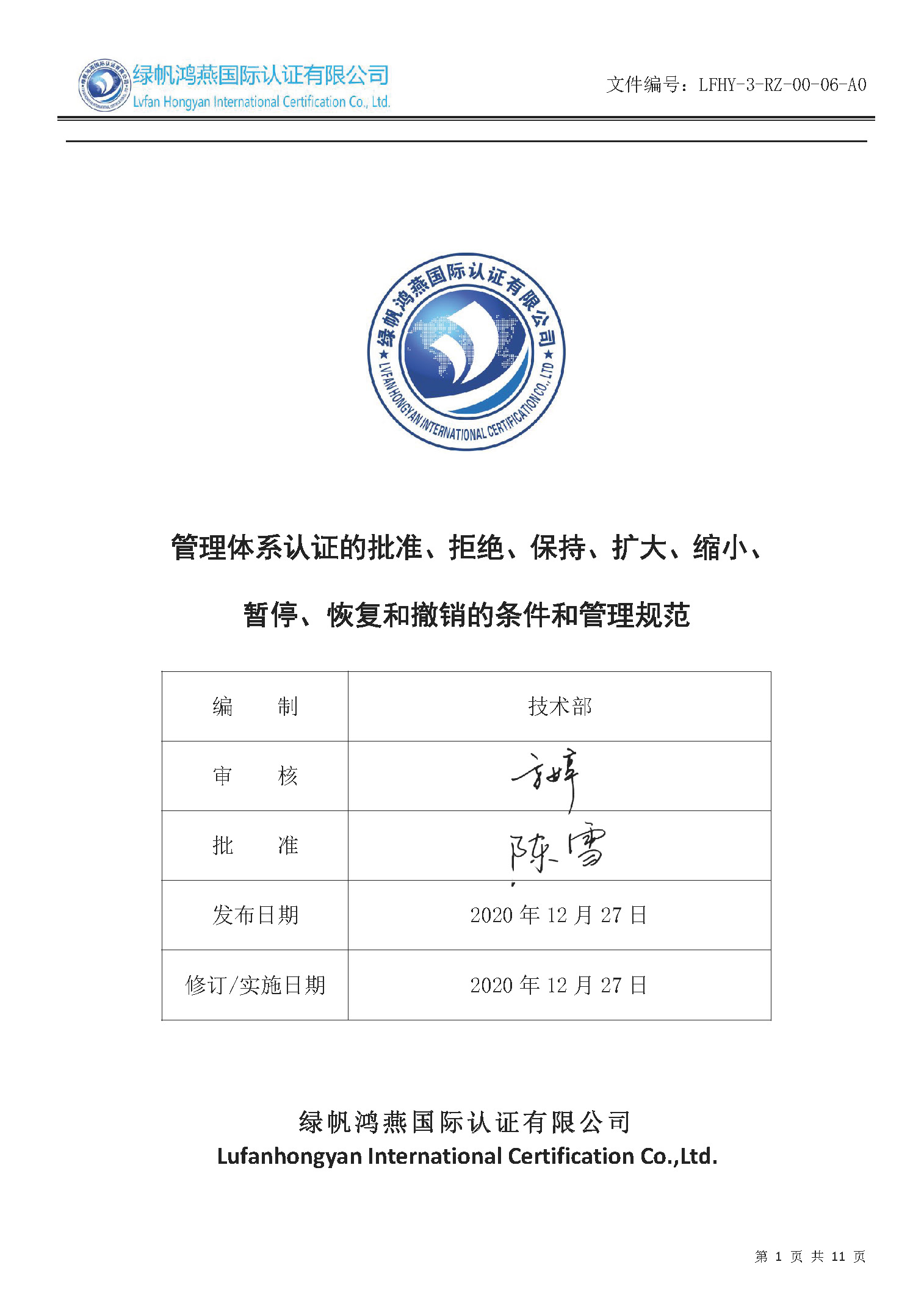 LFHY管理體系認(rèn)證的批準(zhǔn)、拒絕、保持、擴(kuò)大、縮小、暫停、恢復(fù)和撤銷(xiāo)的條件和管理規(guī)范
